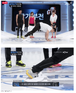 동작을 할대는 몸의 중심이 무릎에 쏠려 무리가 가지 않도록 각별히 주의해야 한다